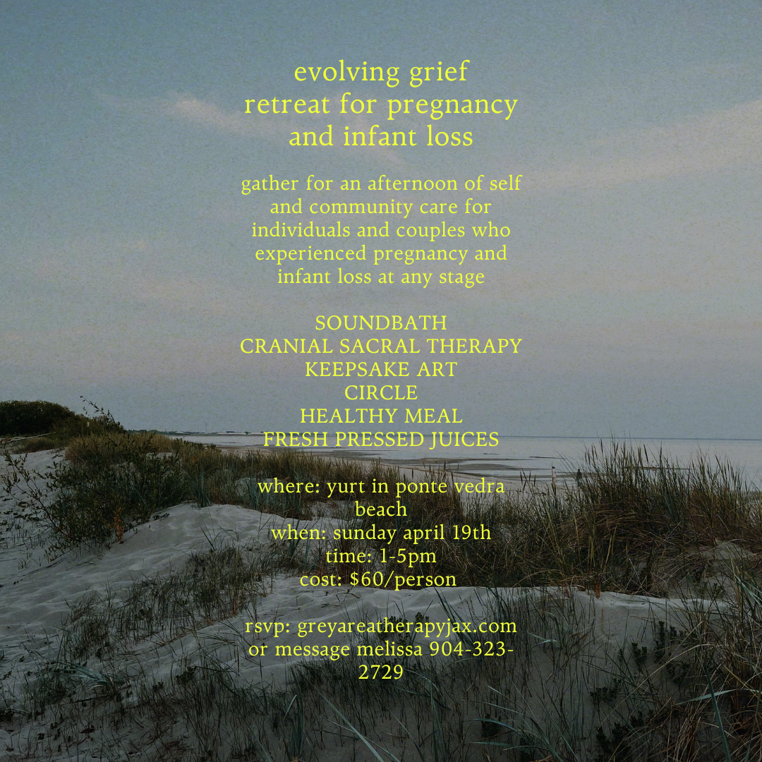Pregnancy and Infant Loss Retreat - April 2026 Gather for an afternoon of support, rest, honoring your baby and experiences and connection with other people who have also experienced pregnancy and infant loss. Facilitated by Melissa Moulton, LCSW, this retreat was created for both couples and individuals and will be held at a yurt in Ponte Vedra on Sunday, April 19th from 1-5pm. Grandparents, friends and other family members impacted by loss are welcome to attend with you.